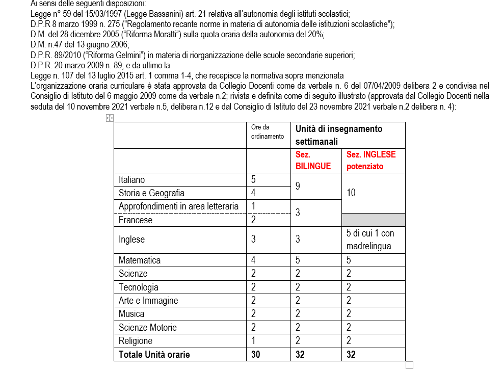 L’organizzazione curriculare settimanale prevede una Unità di Insegnamento in più di Matematica ( come potenziamento materie STEAM) e una di Attività Formative ricavate in autonomia con riferimento al 30% previsto. L’organizzazione oraria prevede settimanalmente 1 ora di 65′; 4 ore di 60′, 2 ore da 55′ e 2 ore da 50′; con 6 Unità di Insegnamento distribuite su 5 giorni di scuola più un rientro di 2 ore (da 60’) di lezione settimanale.